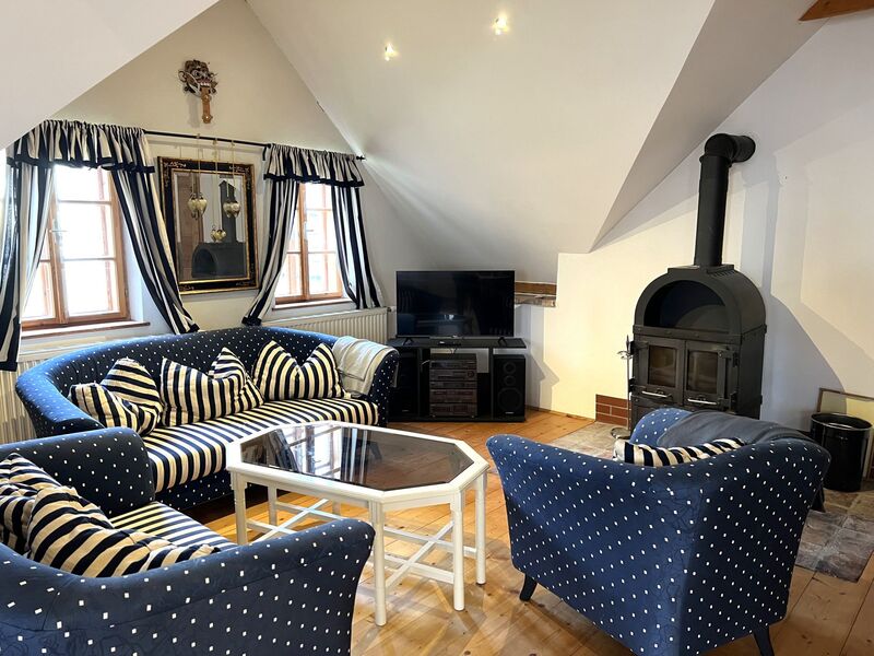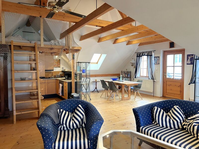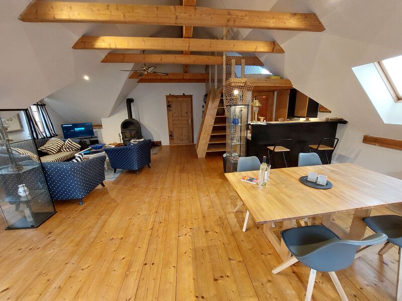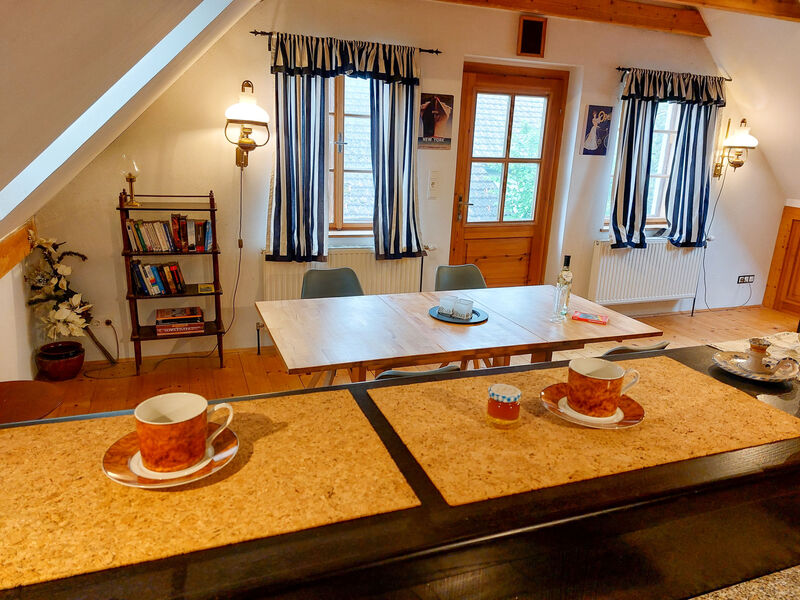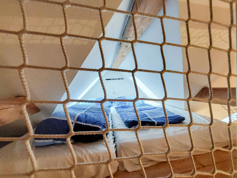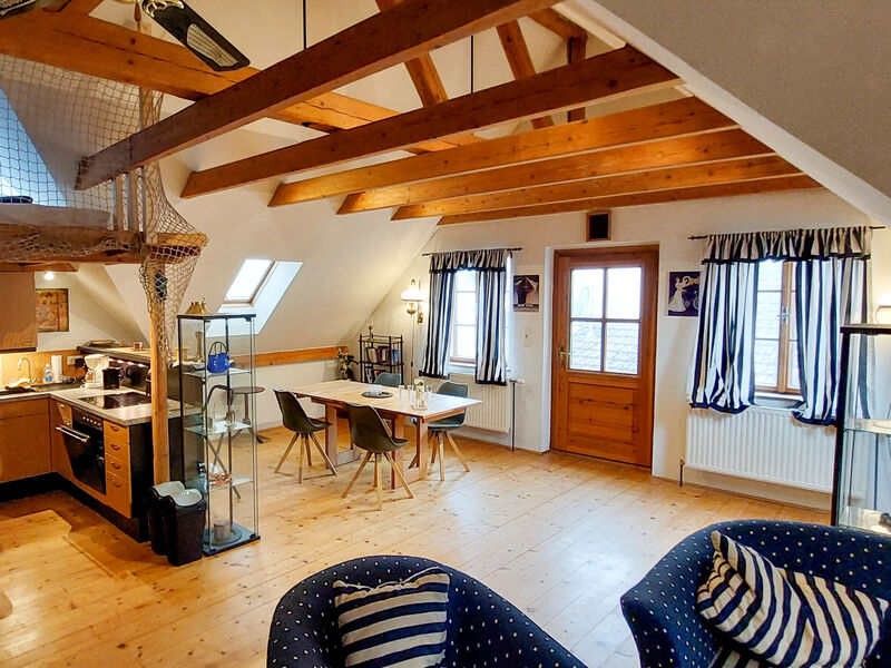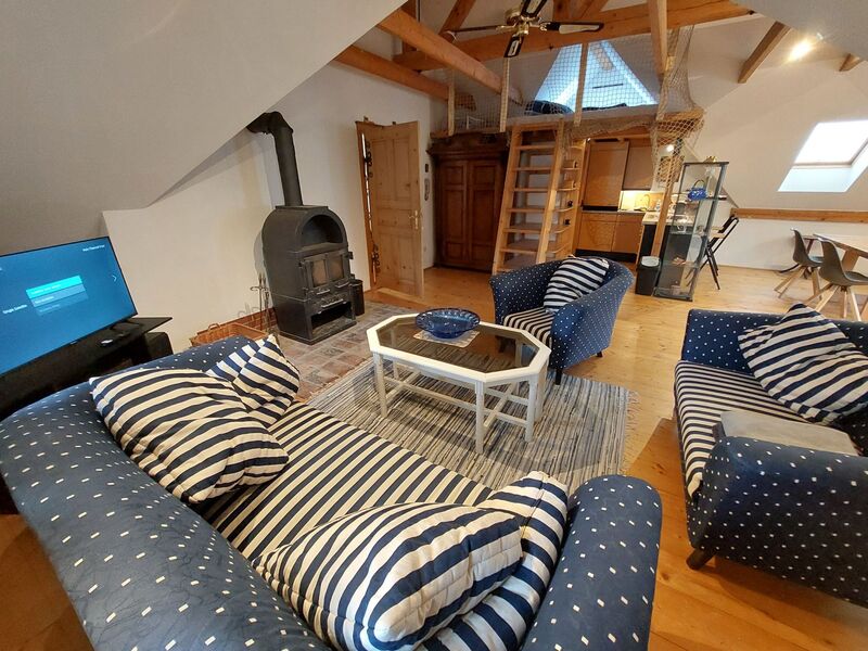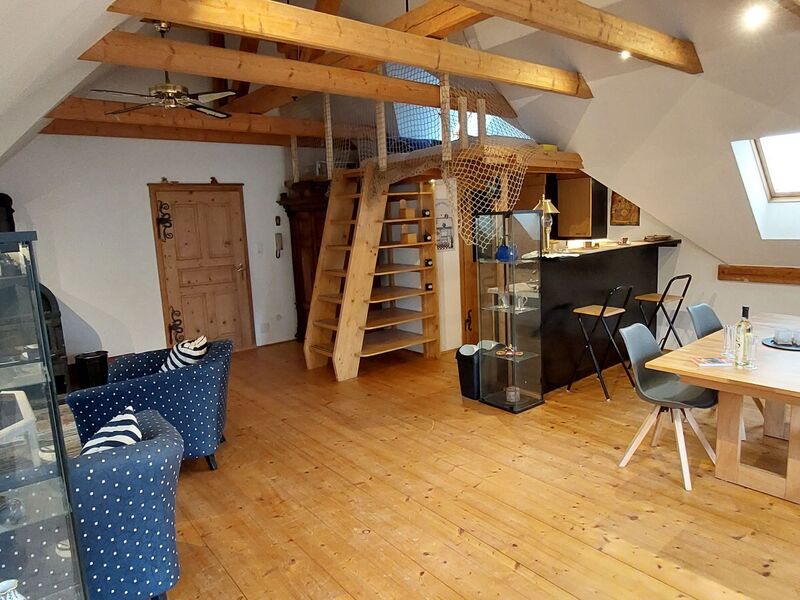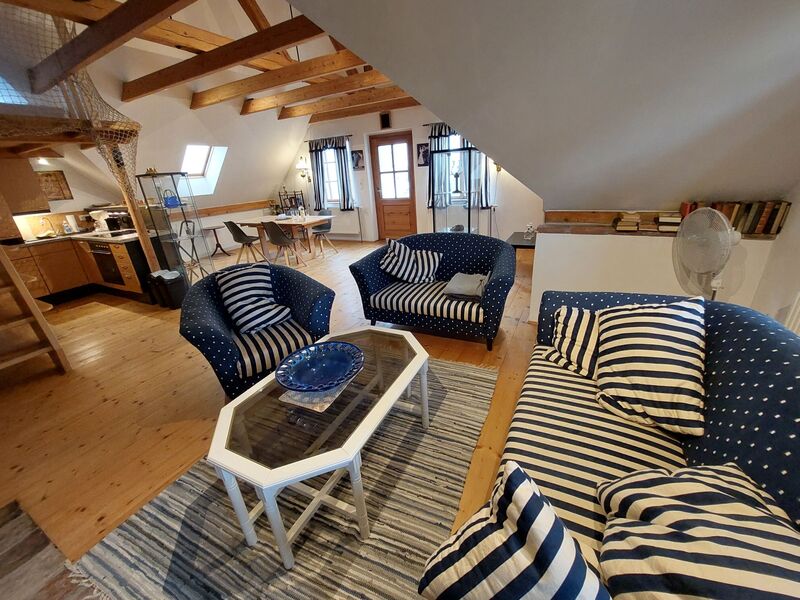 Loft, 1-kamer 70 m2, op de bovenverdieping. Het objekt is geschikt voor 2 volwassenen. Rustiek en smaakvol ingericht: open woon-/eetkamer met afgeschuinde daken met dakraam met 1 x 1 stapelbedden (180 cm, lengte 200 cm). Met afgeschuinde daken, open keuken (4-pits kookplaat, oven). Bad/WC. Verwarming. Houten vloeren. Uitzicht op de tuin. Niet rokers woning. Privé ingang.