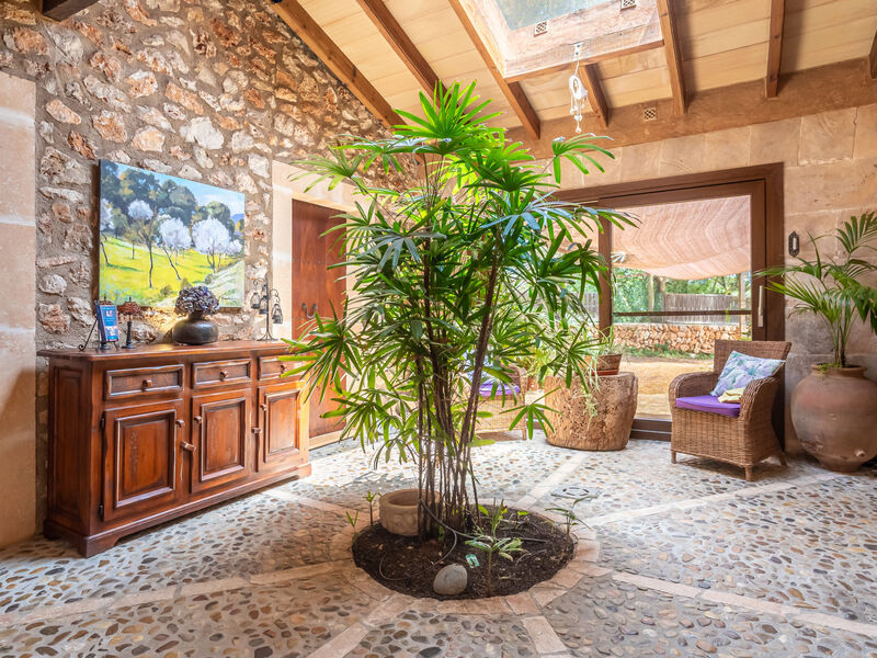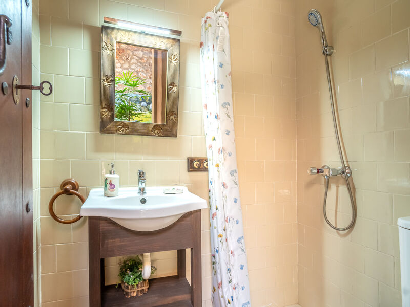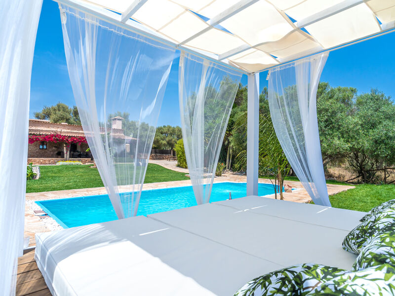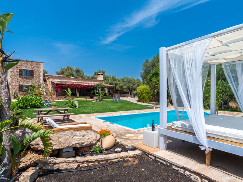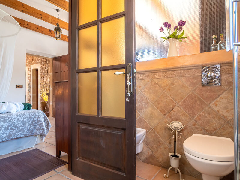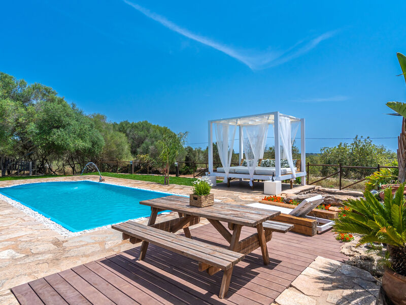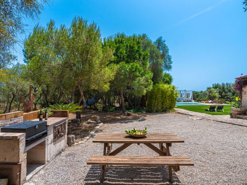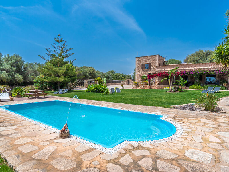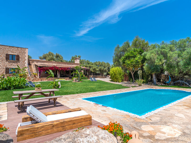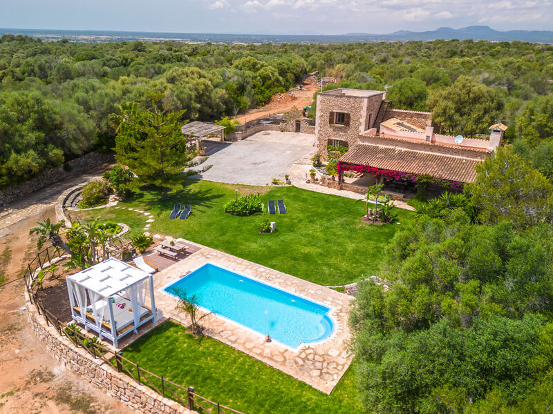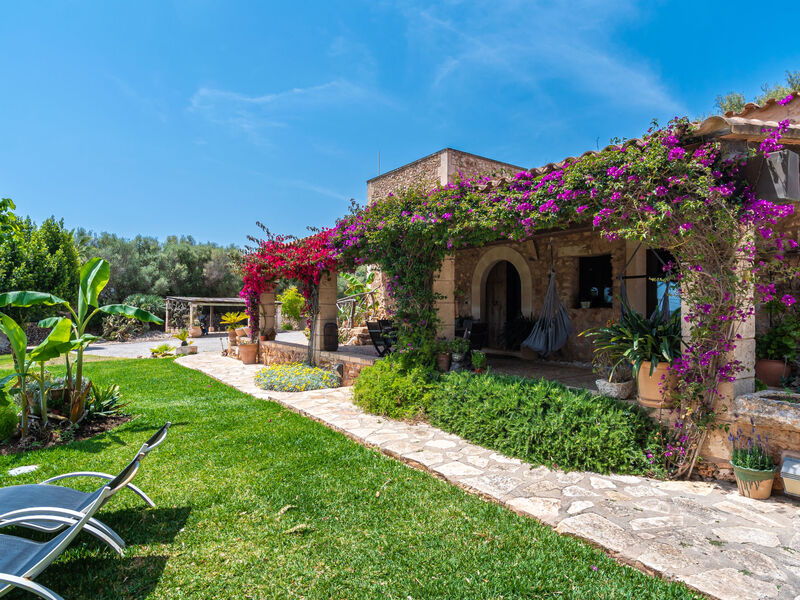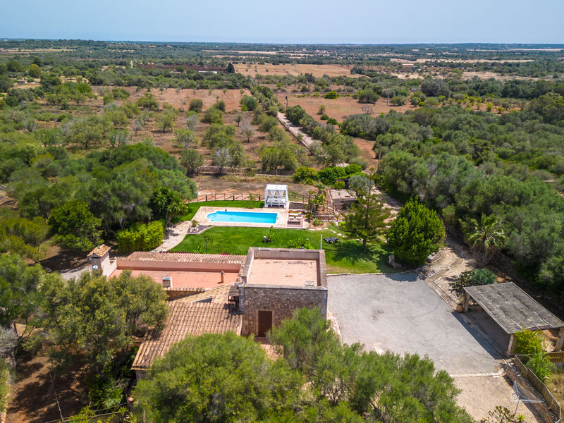 Zeer mooi, comfortabele villa "Sa Caseta", van 2 verdiepingen, gerenoveerd. Huurobject bestaande uit hoofd-/ bijgebouw, buiten de plaats, 6 km van het centrum van Ses Salines, rustige, zonnige ligging, 12 km van zee, te midden van groen. Voor alleengebruik: mooie, verzorgde tuin met gazon en planten, openluchtzwembad hoekig (10 x 4 m, 90 - 210 cm diepte, seizoensgebonden beschikbaarheid: 01.Jan. - 31.Dec.) met zout-elektrolyse. Buitendouche, patio, prieel, prieel, tuinmeubelen, barbecue, kinderspeelplaats, onderhoud zwembad door de eigenaar/tuinman. In het huis: bergruimte voor fietsen, centrale verwarming. Toegangsweg (500 m onverharde weg). Parkeerplaats bij het huis op het terrein. Winkel 6 km, supermarkt 6.2 km, restaurant 6.3 km, bar 6 km, bakkerij 6.2 km, bushalte "Ses Salines" 6 km, treinstation "Manacor" 37 km, zandstrand "Es Trenc" 12 km, rotsstrand "Es Caló des Moro" 6 km. Jachthaven 11.5 km, golfterrein (18 holes) 20 km, fietspad 200 m. Attracties in de buurt: Santanyí 7 km, Cala Santanyí 8 km, Colonia Sant Jordi 11.4 km, Palma City 52 km, Felanitx 19 km. Wandelgebied Serra de Tramuntana, Cap Ses Salines - Cala Llombards 12KMS. Auto noodzakelijk. Het objekt is geschikt voor 6 volwassenen. De eigenaar accepteert geen jeugdgroepen. Dieren in de buurt. Vliegveld 48 km van het huis.