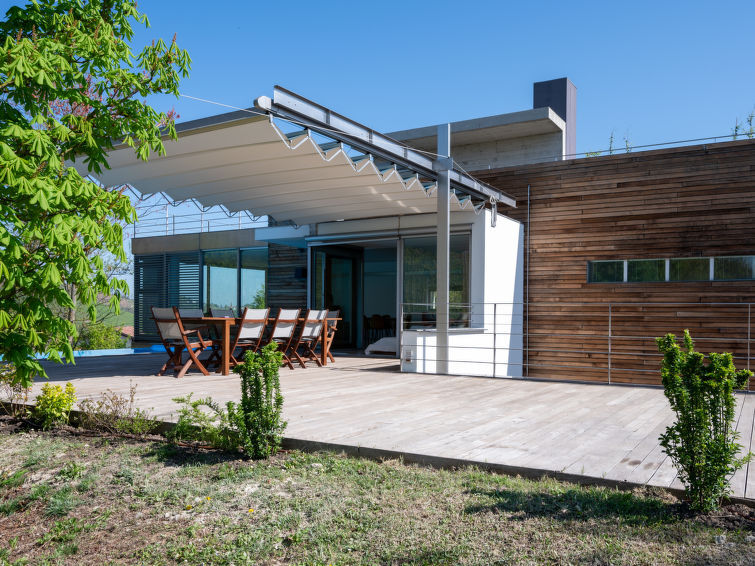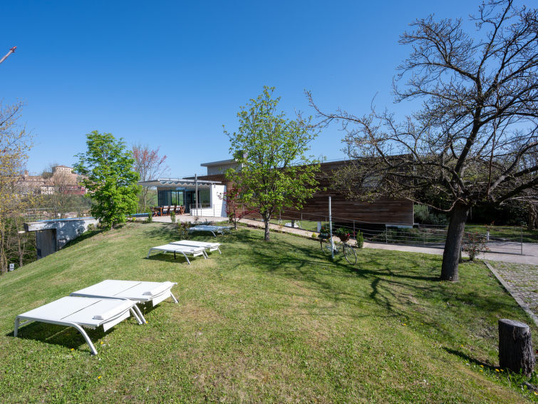 Moderne villa "Stordita", omgeven door bomen en weiden. In de plaats Castellinaldo d'Alba, 10 km van het centrum van Alba, zonnige ligging op een heuvel. Voor alleengebruik: terrein 5.000 m2 met gazon en planten, mooie tuin ter ontspanning, openluchtzwembad (8 x 4 m, 160 cm diepte, seizoensgebonden beschikbaarheid: 01.Mei. - 31.Okt.). Buitendouche. Ontbijt op aanvraag (extra). Parkeerplaats (voor 5 auto's) bij het huis. Oplaadstation. Levensmiddelenwinkel 1 km, supermarkt 5 km, restaurant 750 m, bar 850 m, fietsverhuur 5 km, bushalte "Castellinaldo d'Alba" 750 m. Attracties in de buurt: Vezza d'Alba 5 km, Barbaresco 12 km, La Morra 27 km. Auto noodzakelijk.