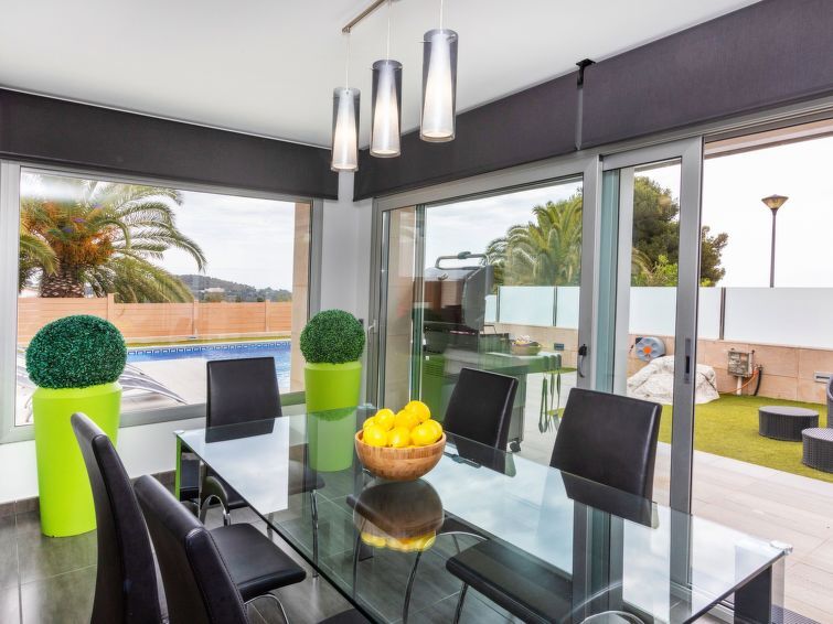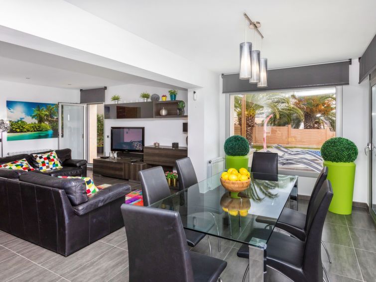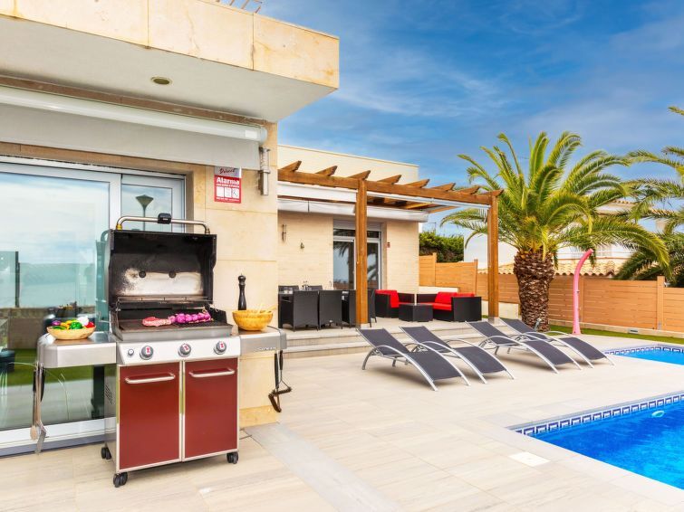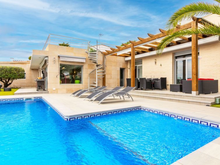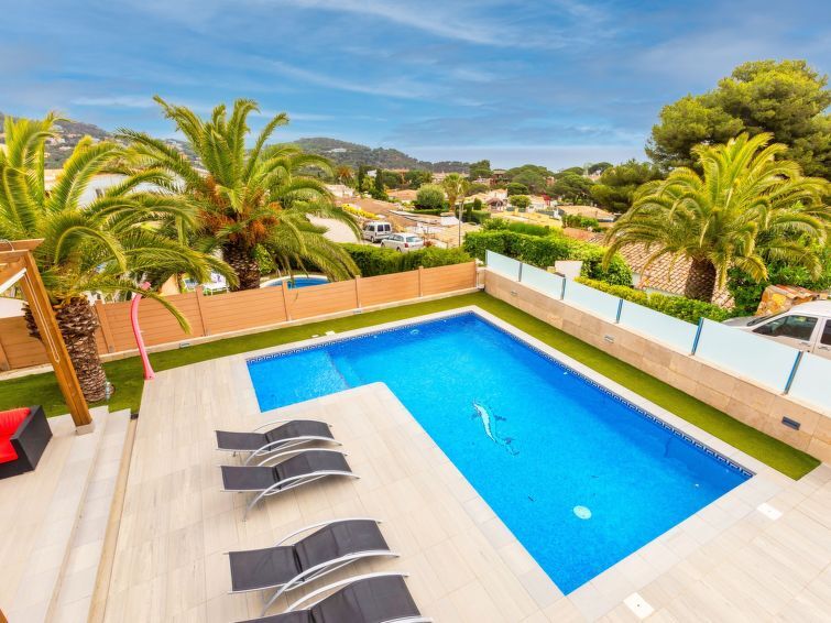 "Chill", villa 5-kamers 250 m2. Ruim en licht, zeer comfortabel en modern ingericht: woon-/eetkamer met eettafel, Digitale TV, air-conditioning en heteluchtverwarming. Uitgang naar het terras, naar het zwembad. 1 2-pers. kamer met 2 bedden (90 cm, lengte 190 cm), Digitale TV. 2 2-pers. kamers, elke kamer heeft 1 2-pers bed (160 cm, lengte 190 cm), douche/WC. 1 groot 2-pers. kamer met 1 2-pers bed (160 cm, lengte 190 cm), bad/bidet/WC en Digitale TV. Uitgang naar het terras, naar het zwembad. Groot, open keuken (oven, afwasmachine, 4 keramische glas kookplaten, broodrooster, waterkoker, magnetron, diepvriezer, elektrische koffiemachine) met bar. Douche/WC. Terrasmeubelen, ligstoelen. Uitzicht in de verte op zee en de plaats. Ter beschikking: wasmachine, droger, strijkijzer, kinderstoel, kinderbed tot 2 jaar, haardroger. Internet (WiFi, gratis). Geschikt voor families. TV alleen ES. HUTG-024555 // Reg. Nr.: ESFCTU00001702100009519300000000000000000HUTG-0245550