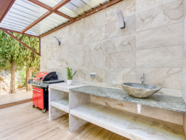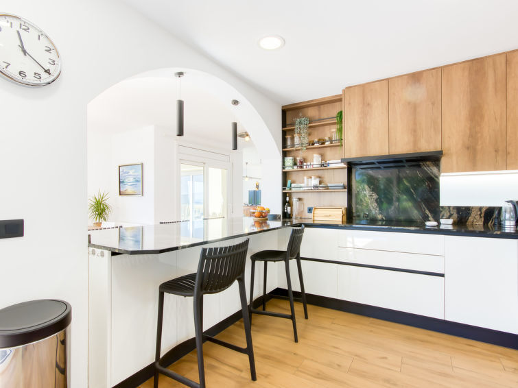Villa 6-kamers 318 m2 op 3 verdiepingen. Ruim en licht, modern en stijlvol ingericht: woon-/eetkamer met eettafel, Sat-TV en Digitale TV (Flatscreen TV). Uitgang naar het terras, naar het zwembad. Groot, open keuken (oven, afwasmachine, 3 inductiekookplaten, broodrooster, waterkoker, magnetron, diepvriezer, elektrische koffiemachine). Aparte WC. Souterrain: (buitentrap) woon-/eetkamer met ventilator. Uitgang naar het terras. 1 kamer met 1 2-pers bed (160 cm, lengte 190 cm), air-conditioning, ventilator en heteluchtverwarming. 1 kamer met 2 bedden (90 cm, lengte 190 cm), ventilator. Kookhoek (waterkoker, magnetron). Douche, aparte WC. Bovenverdieping: 1 kamer met 2 bedden (90 cm, lengte 190 cm), air-conditioning, ventilator en heteluchtverwarming. 1 kamer met 1 2-pers bed (160 cm, lengte 190 cm), air-conditioning, ventilator en heteluchtverwarming. Bad/douche/WC. 2e Verdieping: 1 groot kamer met 1 2-pers bed (180 cm, lengte 190 cm), douche/WC, air-conditioning, ventilator en heteluchtverwarming. Uitgang naar het terras. Groot terras. Terrasmeubelen, barbecue, ligstoelen. Mooi panoramazicht op zee en de bergen. Ter beschikking: wasmachine, strijkijzer, haardroger. Internet (WiFi, gratis). Parkeerplaats bij het huis. Rookvrij huis. TV alleen FR, DE, ES. Geen lift. HUTG-010952